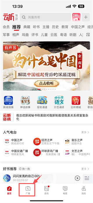 1、打開音頻類應(yīng)用,點(diǎn)擊底部廣播選項(xiàng),進(jìn)入廣播頁面。