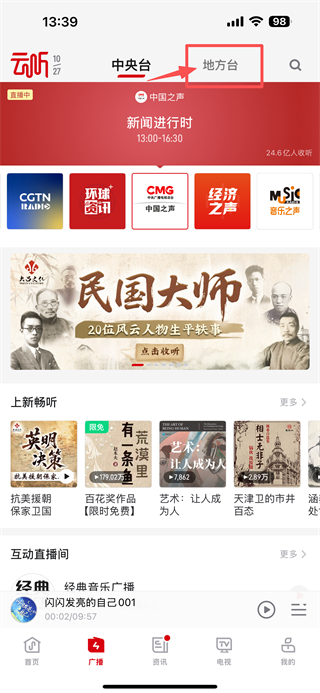 2、在廣播頁面,點(diǎn)擊地方臺(tái)分類選項(xiàng),瀏覽地方臺(tái)廣播列表。