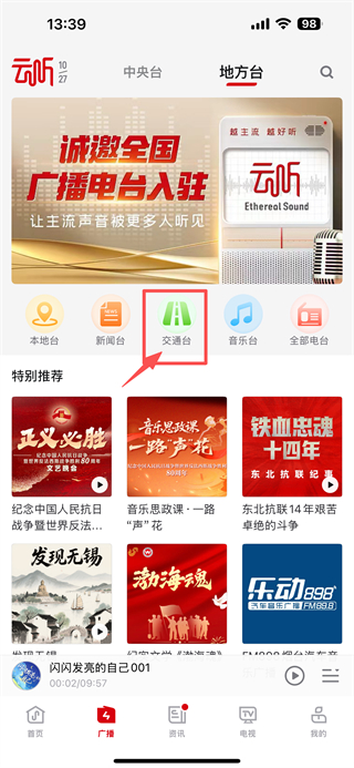 3、在地方臺(tái)廣播列表里,點(diǎn)擊交通臺(tái)標(biāo)簽,篩選出交通類地方臺(tái)廣播。