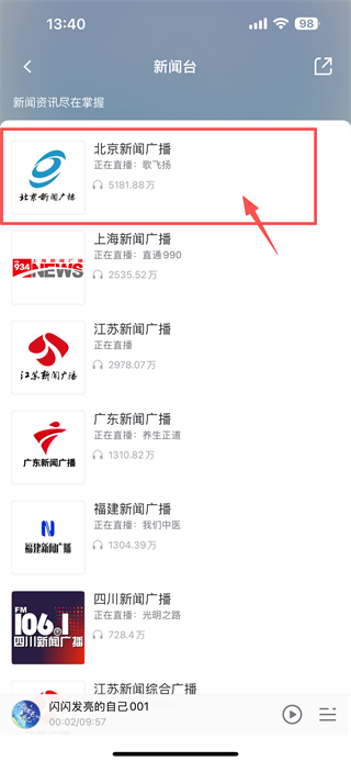 4、在篩選結(jié)果中,找到北京新聞廣播電臺(tái)條目,點(diǎn)擊即可收聽該電臺(tái)的直播內(nèi)容。