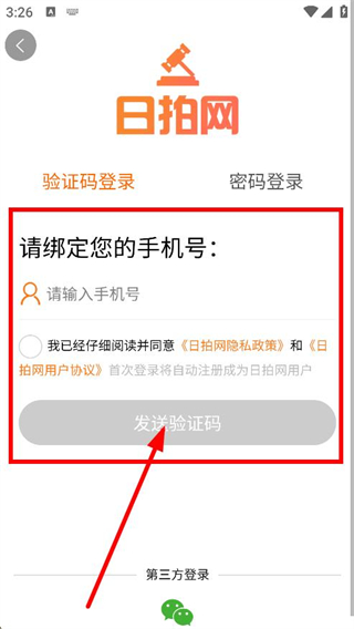 3、在登錄頁面,輸入手機(jī)號,勾選協(xié)議后,點(diǎn)擊發(fā)送驗證碼。