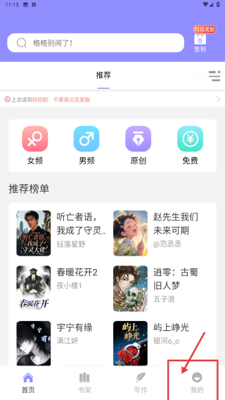 1、打開小說閱讀類應(yīng)用,點(diǎn)擊底部我的選項(xiàng),進(jìn)入個(gè)人中心頁面。