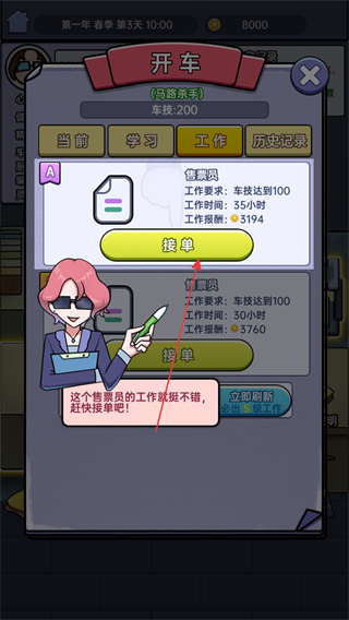 2、車技達(dá)到要求后,在工作界面選擇售票員等工作接單,獲取工資。