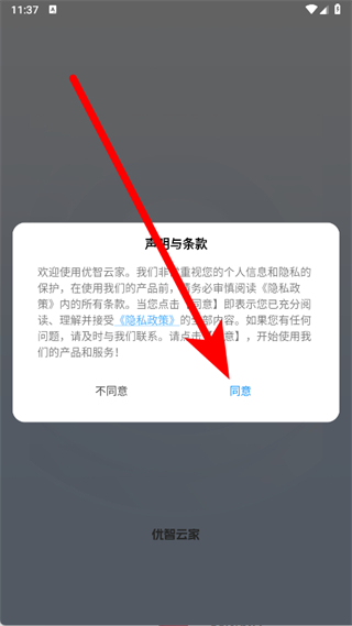 1、打開優(yōu)智云家,在聲明與條款彈窗,點(diǎn)擊同意。