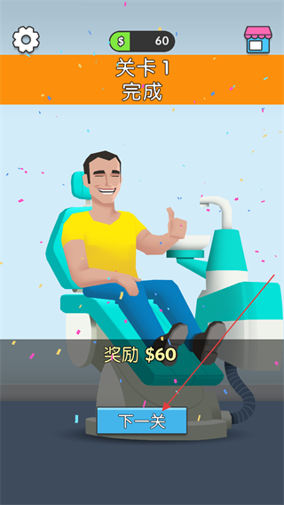4、關(guān)卡1完成,獲得60美元獎(jiǎng)勵(lì),點(diǎn)擊下一關(guān)繼續(xù)挑戰(zhàn)。