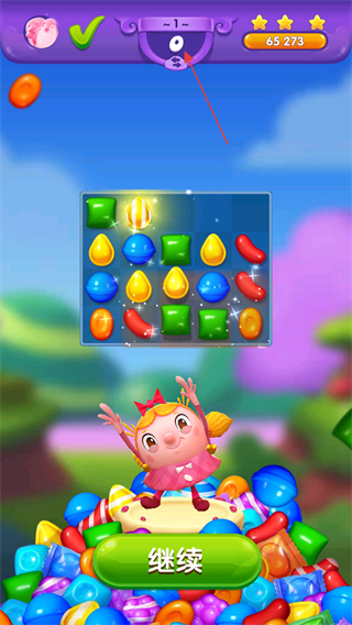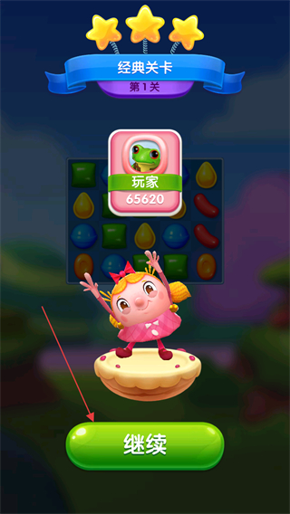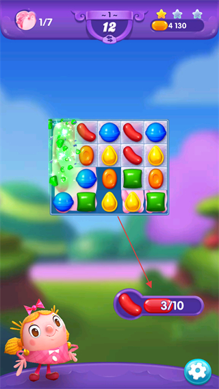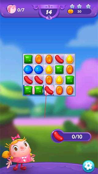 1、進(jìn)入游戲關(guān)卡后,通過滑動糖果湊齊3個以上的糖果進(jìn)行消除。
