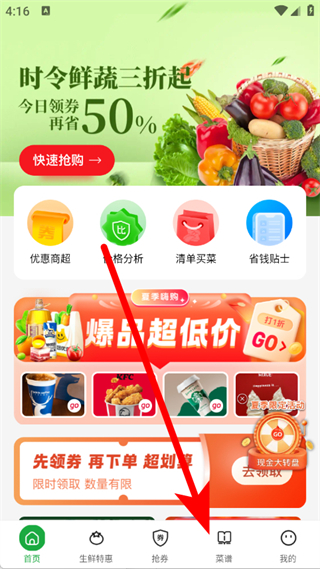 1、打開叮叮生鮮超市,點擊底部導(dǎo)航欄菜譜,進(jìn)入菜譜頁面。