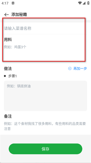 3、在添加菜譜頁面,輸入菜譜名稱與用料信息。