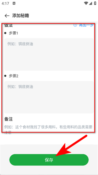 4、輸入做法步驟后,點擊保存按鈕,完成菜譜添加。