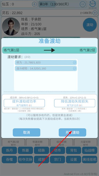 1、在游戲主界面,可查看自身修為、戰(zhàn)斗經(jīng)驗等信息,當修為和戰(zhàn)斗經(jīng)驗滿足條件時,點擊渡劫按鈕。