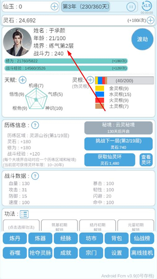 4、渡劫成功后,回到主界面,可看到自身境界、戰(zhàn)斗力等屬性得到提升,繼續(xù)積累修為和戰(zhàn)斗經(jīng)驗,為下一次渡劫做準備。