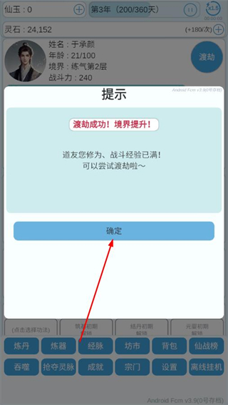 3、渡劫成功后,會彈出提示界面,點擊確定,即可確認境界提升,繼續(xù)修仙之路。
