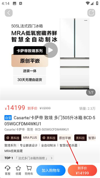 3、在列表頁面,點擊心儀冰箱商品,進入商品詳情頁面。
