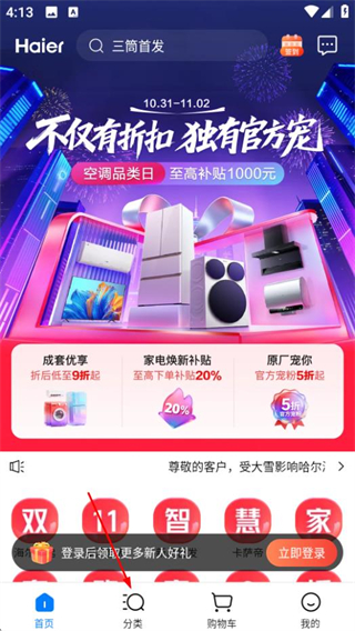 1、打開海爾商城,在首頁點擊分類,進入商品分類頁面。