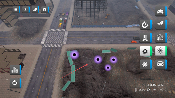 1、選擇右側(cè)的黑洞、核爆等災(zāi)害工具,在城市區(qū)域釋放,制造破壞效果。