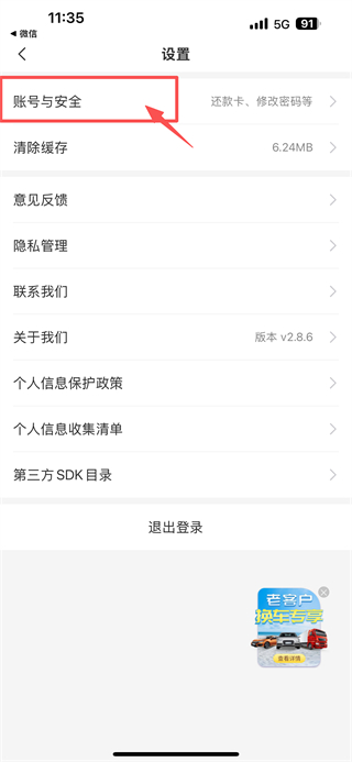 3、在設(shè)置頁面,點(diǎn)擊賬號(hào)與安全選項(xiàng),進(jìn)入賬號(hào)與安全頁面。