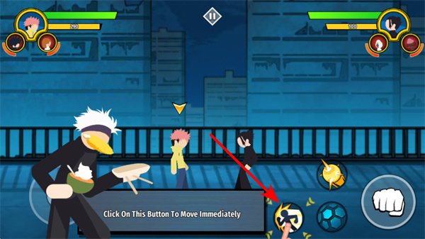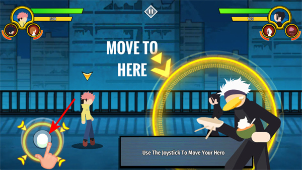 1、在格斗游戲中,通過左下角的虛擬搖桿操控英雄移動,按照MOVE TO HERE指引移動角色,角色戰(zhàn)斗布局。