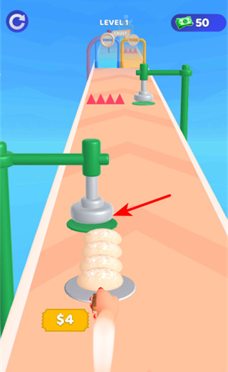1、在烘焙跑酷游戲中,操作壓面裝置將面團壓平,這是制作面食的第一步,壓平的面團是后續(xù)添加配料和烘焙的基礎(chǔ)。