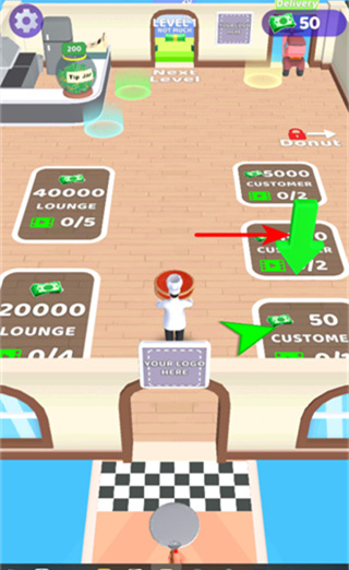 4、進入餐廳區(qū)域后,按照箭頭指引前往顧客區(qū)域,為顧客提供制作好的面食,滿足需求可獲取金幣,推動餐廳的發(fā)展。