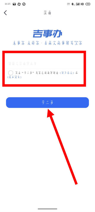 3、填寫注冊信息,勾選吉事辦相關用戶協(xié)議后,點擊下一步。