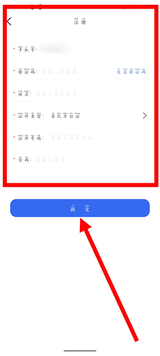 4、完善賬號、密碼、證件類型及號碼等信息后,點擊提交,完成賬號注冊。