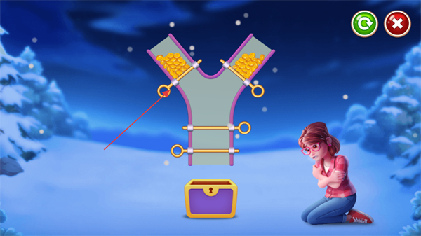 3、不同關(guān)卡的小游戲都不一樣,比如有拉動圓環(huán)使金幣順著管道落入下方的寶箱中即為關(guān)卡勝利的關(guān)卡等。