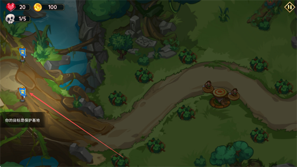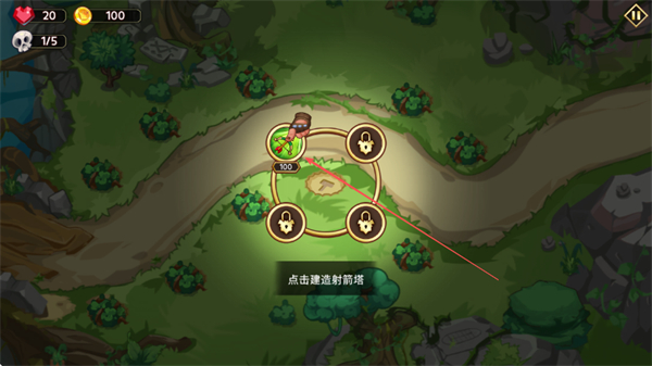 1、消耗100金幣點擊建造射箭塔,在路徑關鍵處布置防御。