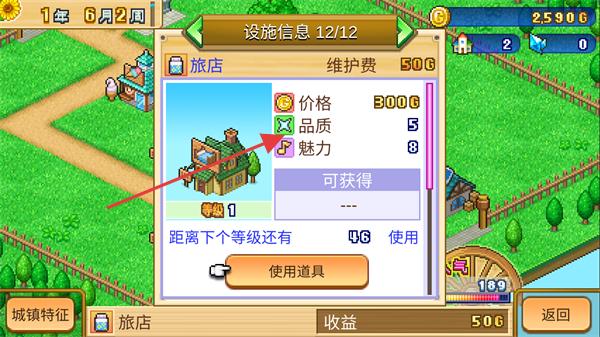 4、點擊建造好的旅店可以查看當(dāng)前設(shè)施信息,通過使用道具可以提升品質(zhì)魅力等屬性。