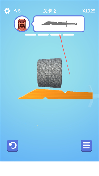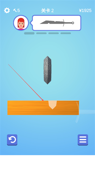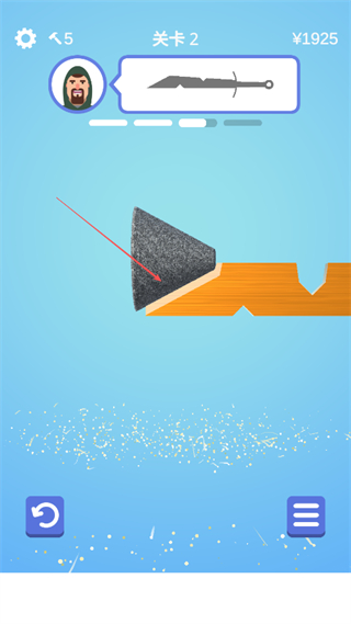 1、在關(guān)卡2中,根據(jù)上方劍的形狀提示,操控砂輪對準(zhǔn)橙色木塊的缺口,開始打磨塑形。