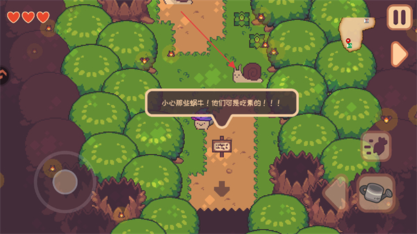 1、在森林中會出現(xiàn)提示告示牌,通過告示牌內(nèi)容可以幫助我們進(jìn)行冒險,注意森林中的蝸牛,他們會對角色造成傷害。