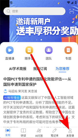1、打開知網(wǎng)研學(xué),點(diǎn)擊底部未登錄,進(jìn)入賬號(hào)登錄頁面。