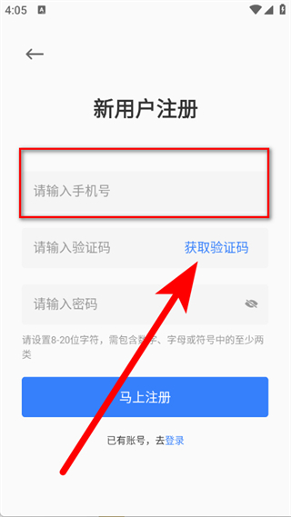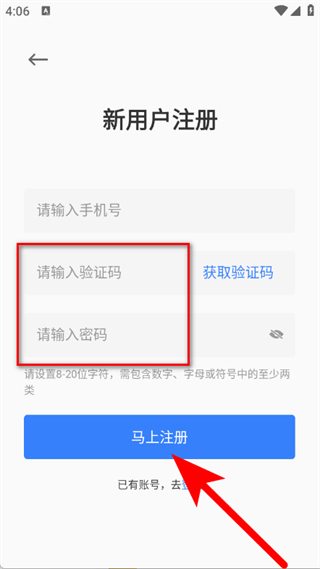 4、輸入驗(yàn)證碼,設(shè)置8-20位且包含數(shù)字密碼,點(diǎn)擊馬上注冊(cè),完成賬號(hào)注冊(cè)。