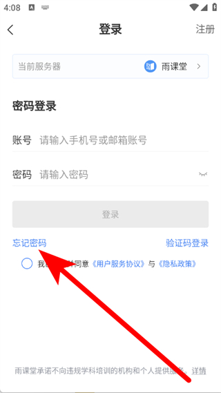 2、在密碼登錄頁(yè)面,點(diǎn)擊忘記密碼,進(jìn)入找回密碼頁(yè)面。