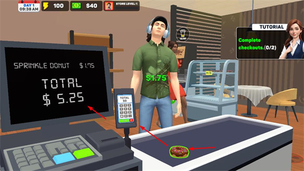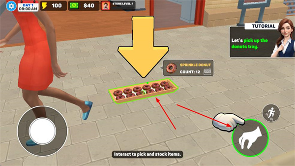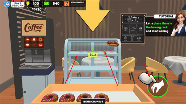 1、拾取甜甜圈托盤,收集商品,為店鋪經(jīng)營準(zhǔn)備貨源,開啟經(jīng)營之旅。