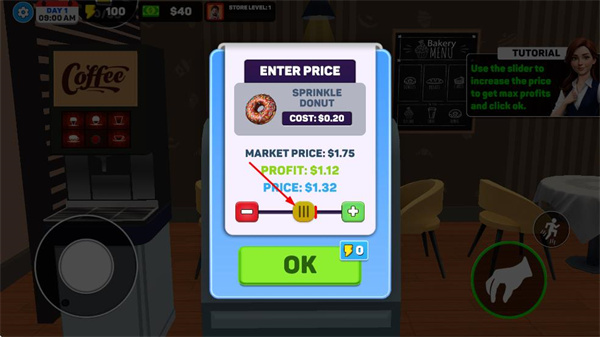 3、調(diào)整甜甜圈價格,利用滑塊設(shè)置合理售價以獲取最大利潤,點(diǎn)擊OK確認(rèn)。