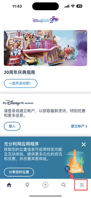 1、打開迪士尼樂園類APP,點(diǎn)擊右下角菜單圖標(biāo),進(jìn)入菜單頁面。