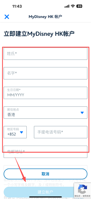 4、在賬戶建立頁面,填寫姓氏、名字、生日日期等信息后,點(diǎn)擊建立帳戶按鈕,完成MyDisney-HK賬戶的注冊操作。