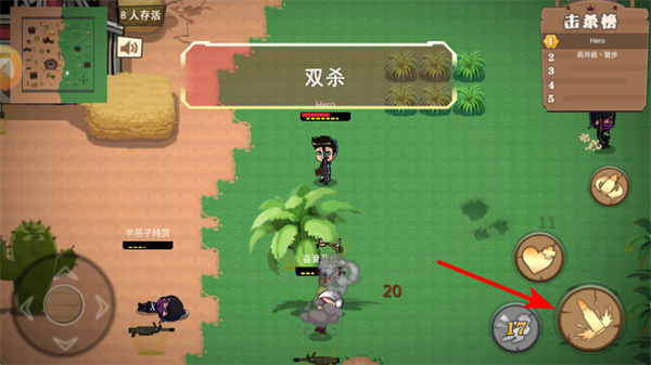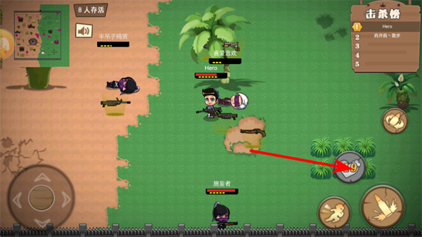 3、點(diǎn)擊攻擊按鈕打擊敵人,攻擊操作是淘汰對手核心步驟,精準(zhǔn)攻擊可消滅敵人,提升擊殺榜排名,獲取優(yōu)勢。