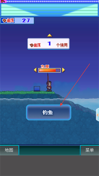 2、點擊上方的力度箭頭挑戰(zhàn)甩桿的力度,點擊下方的釣魚按鈕甩出魚竿。