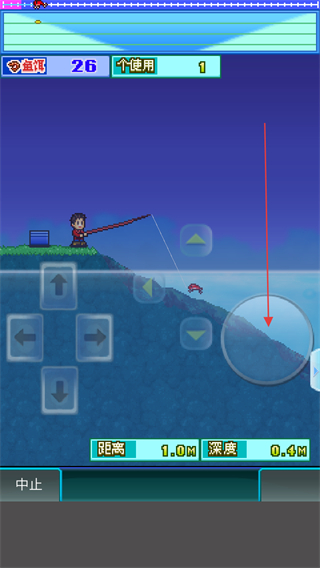 3、點擊右下角的按鈕進(jìn)行收桿操作,或是點擊魚餌上的箭頭控制魚餌的位置。