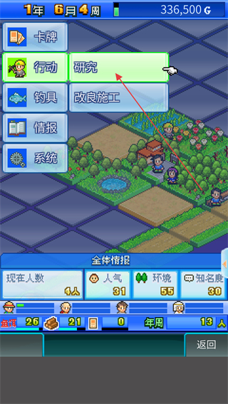 1、在行動菜單欄中點擊研究按鈕,進入公園的研究選項界面。