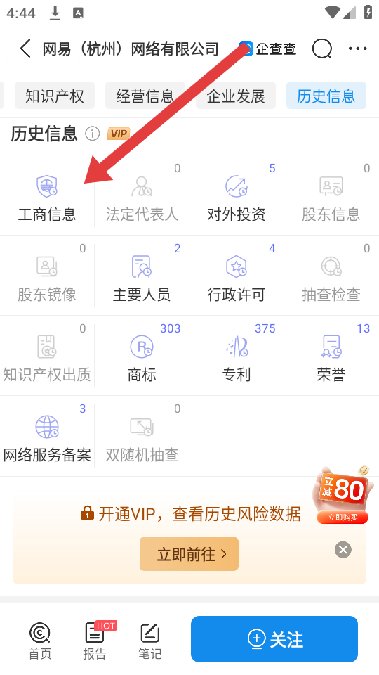 3、在企業(yè)詳情頁切換至歷史信息板塊,找到最底下的工商信息,查看企業(yè)營業(yè)執(zhí)照登記的注冊(cè)資本、法定代表人、成立日期等核心信息。