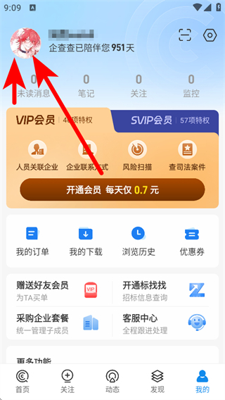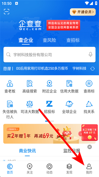1、打開企查查APP,點(diǎn)擊底部導(dǎo)航欄的我的,進(jìn)入個(gè)人功能頁面。