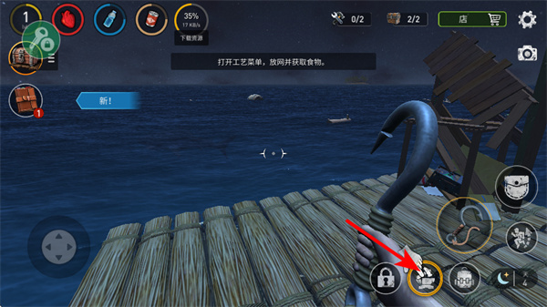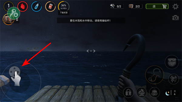 1、游戲中通過(guò)左側(cè)虛擬搖桿操控木筏移動(dòng),這是在水域中探索、收集資源的基礎(chǔ)操作,確保準(zhǔn)確到達(dá)區(qū)域。