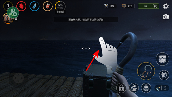 2、滑動(dòng)屏幕可旋轉(zhuǎn)頭部視角,這是觀察周?chē)h(huán)境、發(fā)現(xiàn)資源和危險(xiǎn)的關(guān)鍵操作,需全面查看水域遠(yuǎn)處情況。