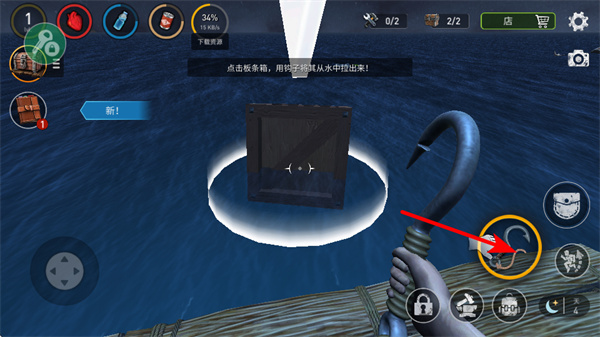 3、點(diǎn)擊鉤子道具可打撈水中的板條箱,這是獲取資源的關(guān)鍵操作,打撈時(shí)需瞄準(zhǔn)板條箱,確保鉤子準(zhǔn)確鉤取。