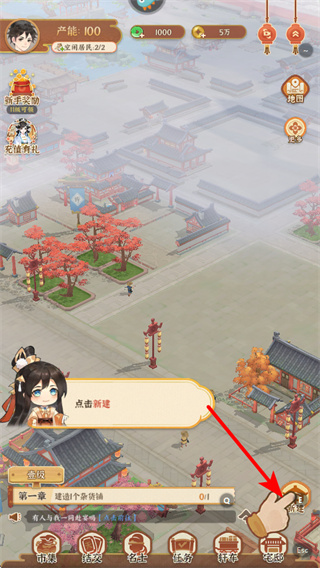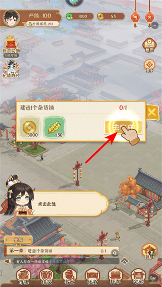 3、根據(jù)任務提示點擊去完成按鈕,可開展如建造個雜貨鋪之類的經(jīng)營任務,這是積累資源,完成后可獲取建設獎勵。