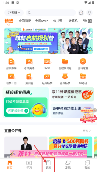 1、打開考研學(xué)習(xí)類APP,點(diǎn)擊底部題庫選項(xiàng),進(jìn)入題庫頁面。