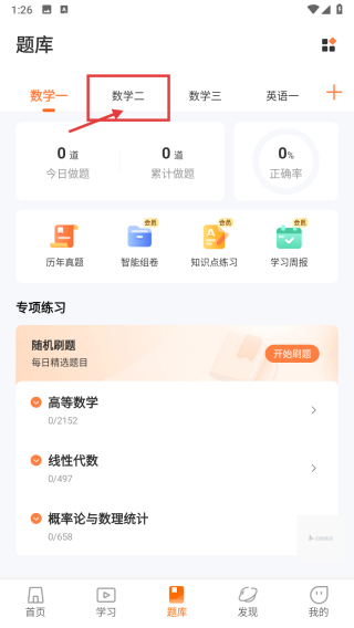 2、在題庫頁面,點(diǎn)擊數(shù)學(xué)二分類標(biāo)簽,進(jìn)入數(shù)學(xué)二題庫頁面。