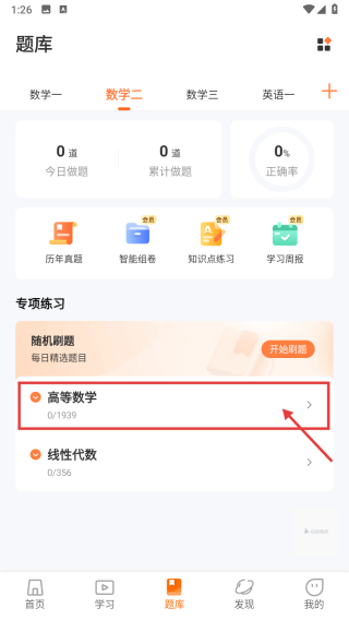 3、在數(shù)學(xué)二題庫頁面,點(diǎn)擊高等數(shù)學(xué)選項(xiàng),進(jìn)入高等數(shù)學(xué)知識點(diǎn)列表頁面。